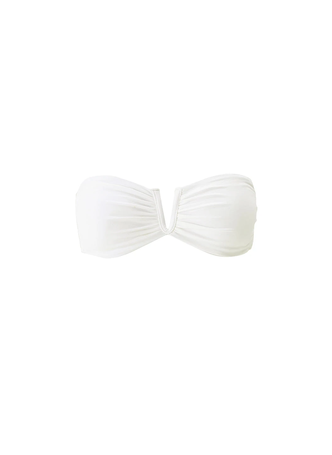 Add to your swimwear contingent with classic pieces you’ll return to time and again like the Alba Bikini Top. Now available in a crisp shade of Ivory, the bandeau top features removable pads with a ‘V’ neckline with subtle ruched detailing, fastening with a neat clasp at the reverse. Style with the matching bottoms to complete the set.