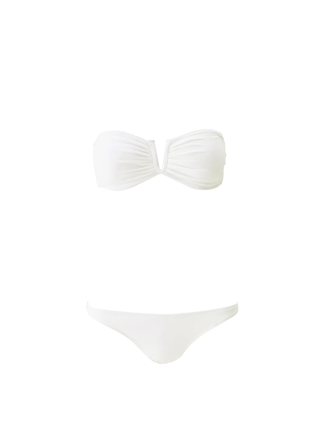 Add to your swimwear contingent with classic pieces you’ll return to time and again like the Alba Bikini. Now available in a crisp shade of Ivory, the bandeau top features removable pads with a ‘V’ neckline with subtle ruched detailing, fastening with a neat clasp at the reverse. Matching bottoms are cut for a relaxed hipster fit and complete the set.