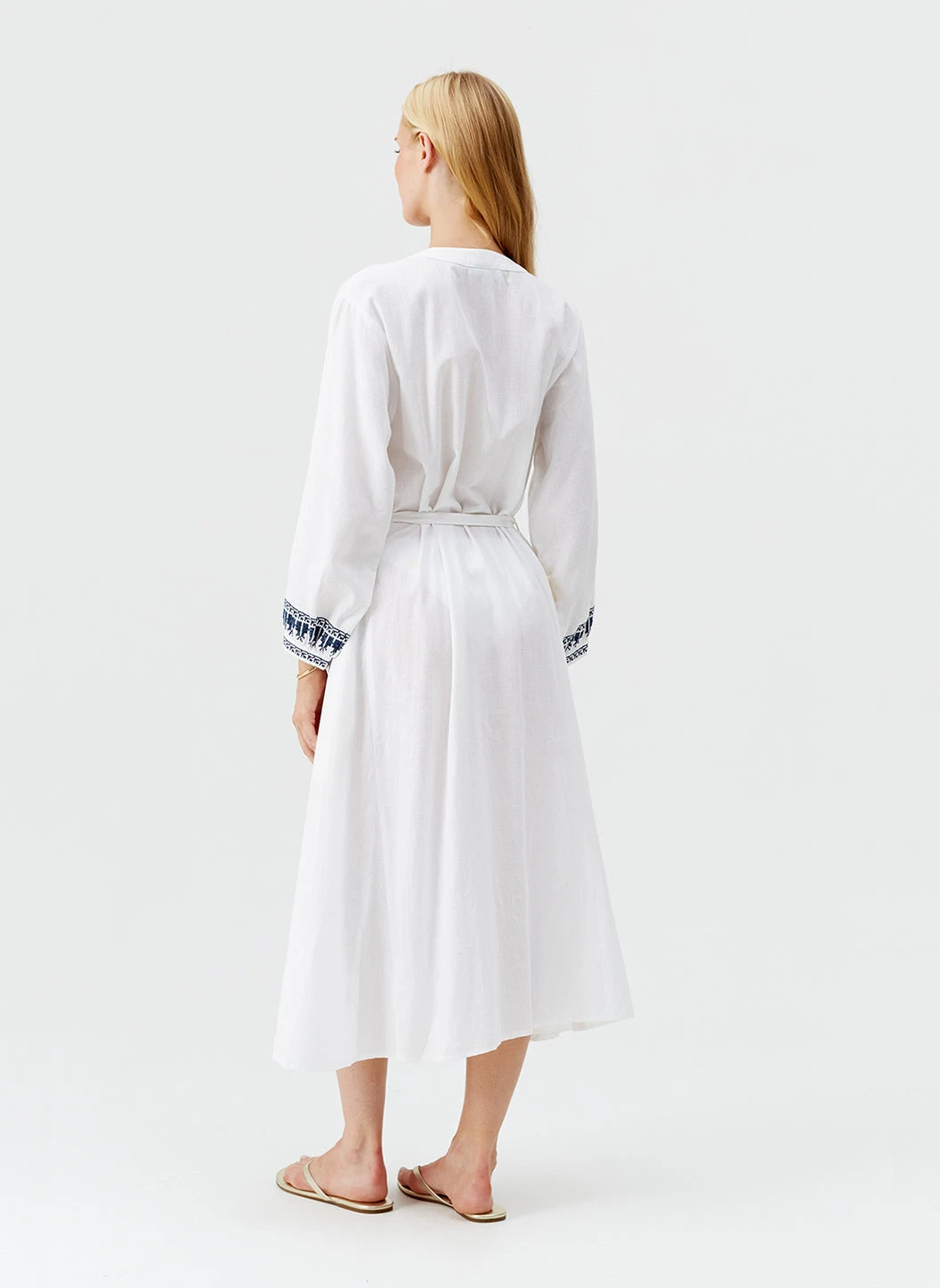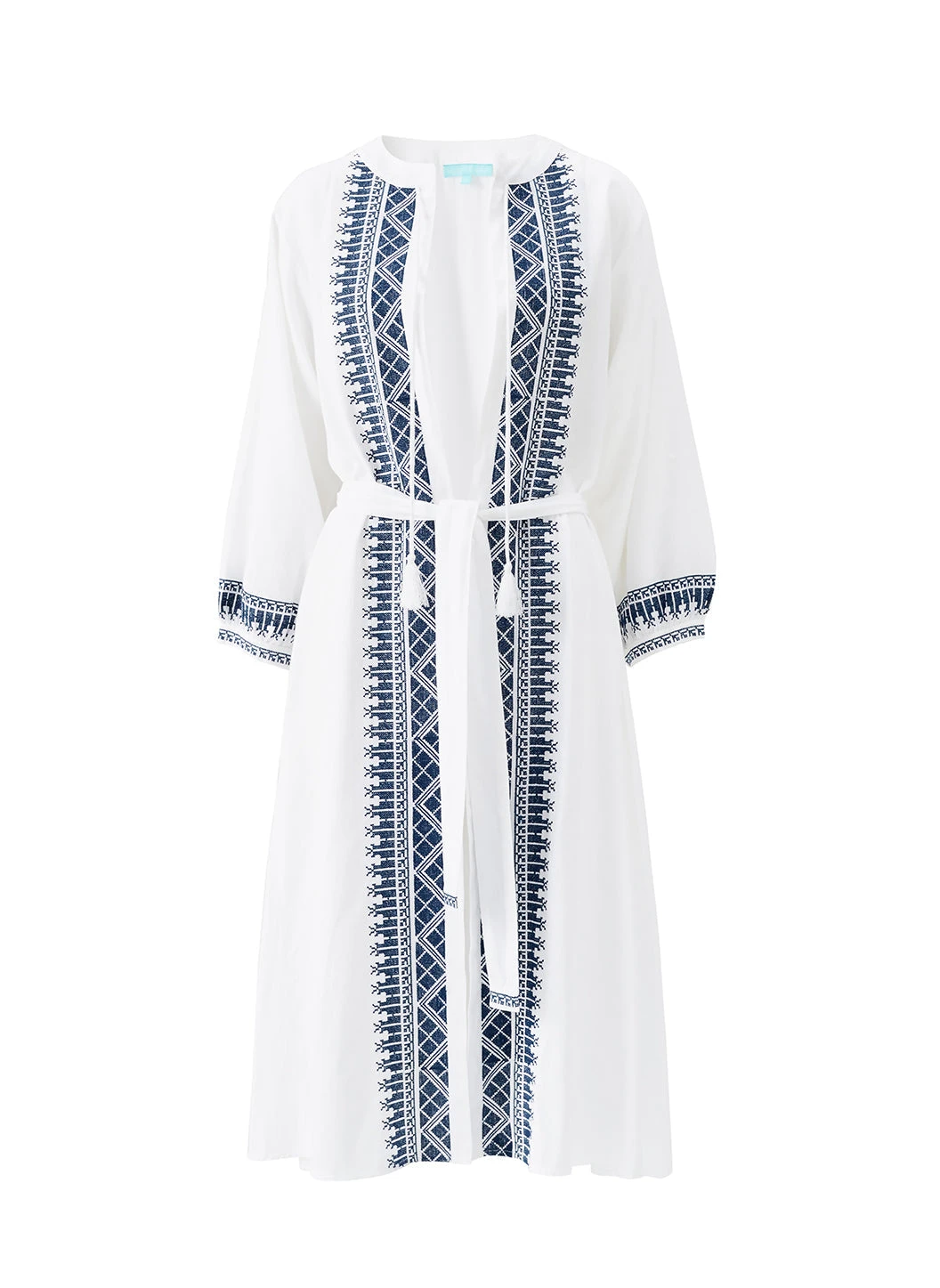 Build your beach cover-up collection with the Audrey Kaftan. Falling to an elegant mid-length, this style is crafted from a premium cotton, linen blend. In crisp, classic white, it boasts intricate contrasting embroidery in a shade of Marine blue bordering the opening and cuffs. Perfect for slipping over your favourite Odabash swimwear, it features tassel ties at the neck and belted waist so you can wear it open or closed.