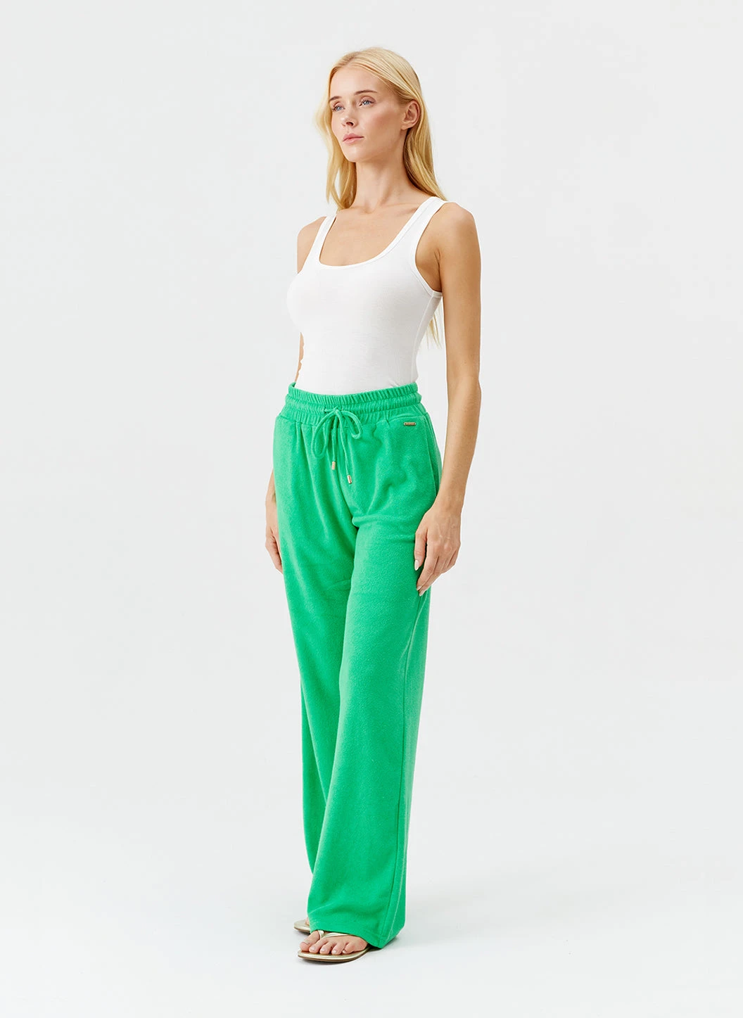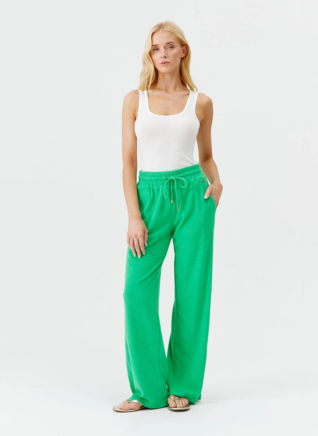 Add a pop of colour to your travel wardrobe with the Betty Trousers. Crafted from super-soft, premium terry fabric, this style is now available in a vibrant shade of green. Designed with comfort in mind, they feature an elasticated waistband, two slip pockets and are cut for a relaxed straight leg fit. Gold branded cord-ends and a matching plaque add a luxe finish and complete the look.