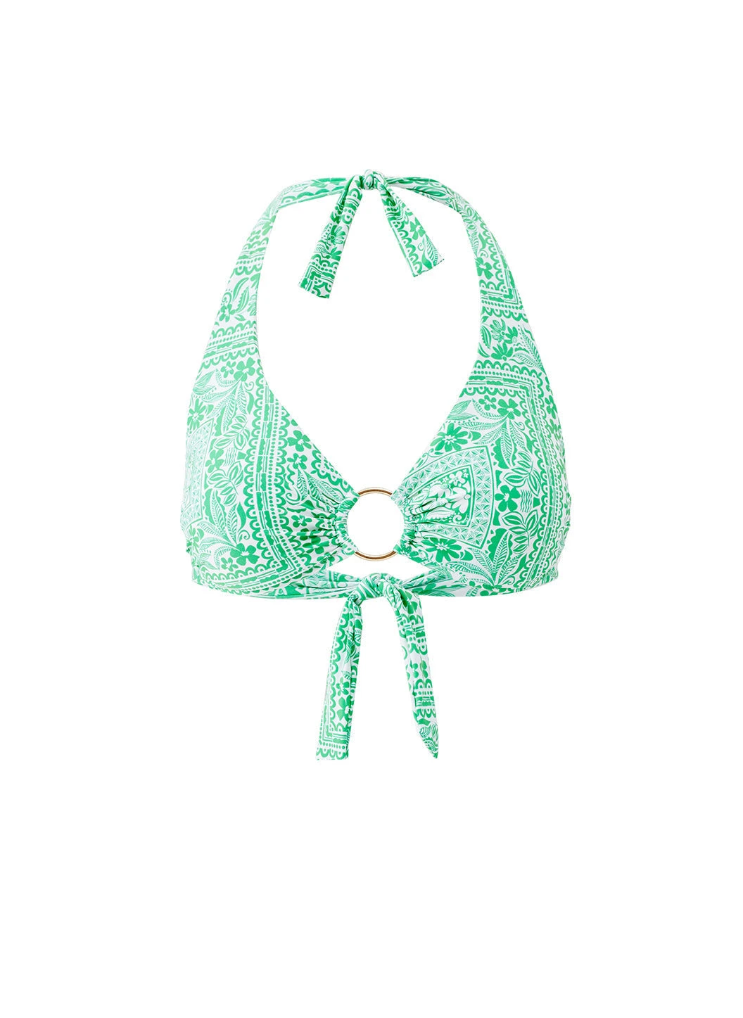 Update your swimwear collection with iconic styles you’ll return to time and again like the Brussels Bikini Top. An Odabash staple, this two-piece has been updated in our green and white Medina print for Spring/Summer 2025. The halterneck top provides support and features a decorative gold ring at the centre of the bust. Unpadded and underwired, it ties at the back and nape of the neck. Pair with the full coverage bikini bottoms to complete the set.