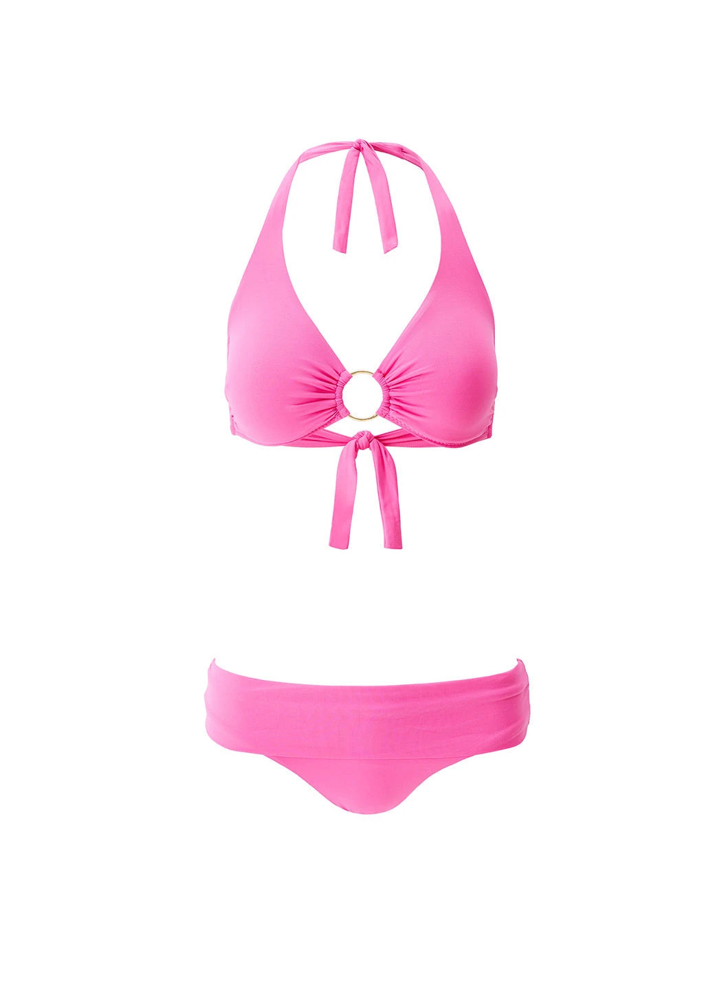 For a glamorous addition to your swim collection, look no further than the Brussels Bikini. An iconic Odabash style, this season sees it reimagined in a vibrant shade of Watermelon pink with SPF 50+ protection. Designed to offer support, the halterneck top is underwired and unpadded with tie straps that allow you to achieve the perfect fit. Adding a luxe detail, is a golden ring trim at the centre of the bust, while the matching hipster bottoms feature a ruched, folded panel for additional coverage.
