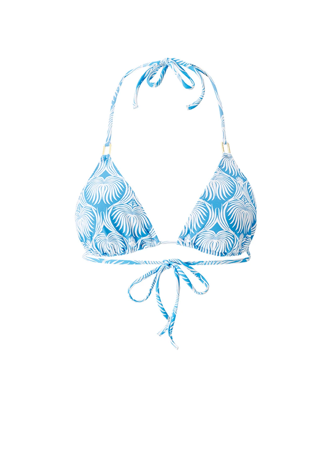 An iconic Odabash shape, add to your swimwear collection with the Cancun Bikini Top. Updated for the season in our blue and white Lotus print, this style is crafted from premium swim fabric providing SPF 50+ protection. The classic triangle top features removable pads, tying at the nape of the neck and at the back and gold rectangular trims add a luxe detail. Pair with the matching Cancun Lotus bikini bottom and style with the Jess Dress in the matching print for a completed look.