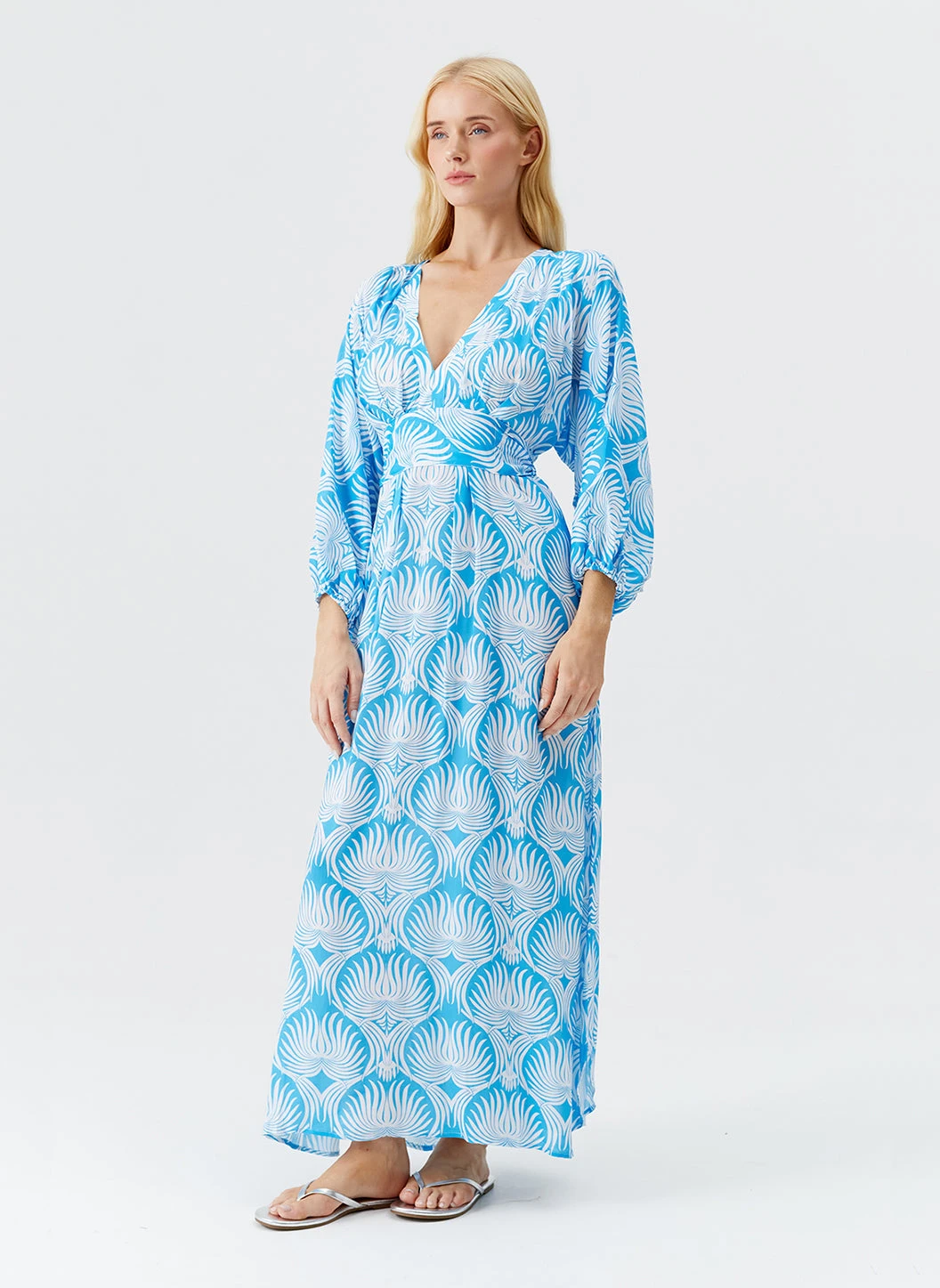 Dramatic and elegant, elevate your warm-weather wardrobe with the Cecilia Dress. Emblazoned in our vibrant Lotus print for Spring/Summer 2025, this piece falls to a sweeping maxi length. It features balloon sleeves with elasticated cuffs, a low ‘V’ neckline with a zip fastening at the reverse. A panel beneath the bust helps to define your silhouette, while a long fabric belt is attached at the sides and designed to be wrapped around the waist.