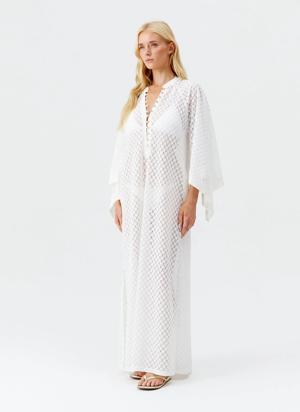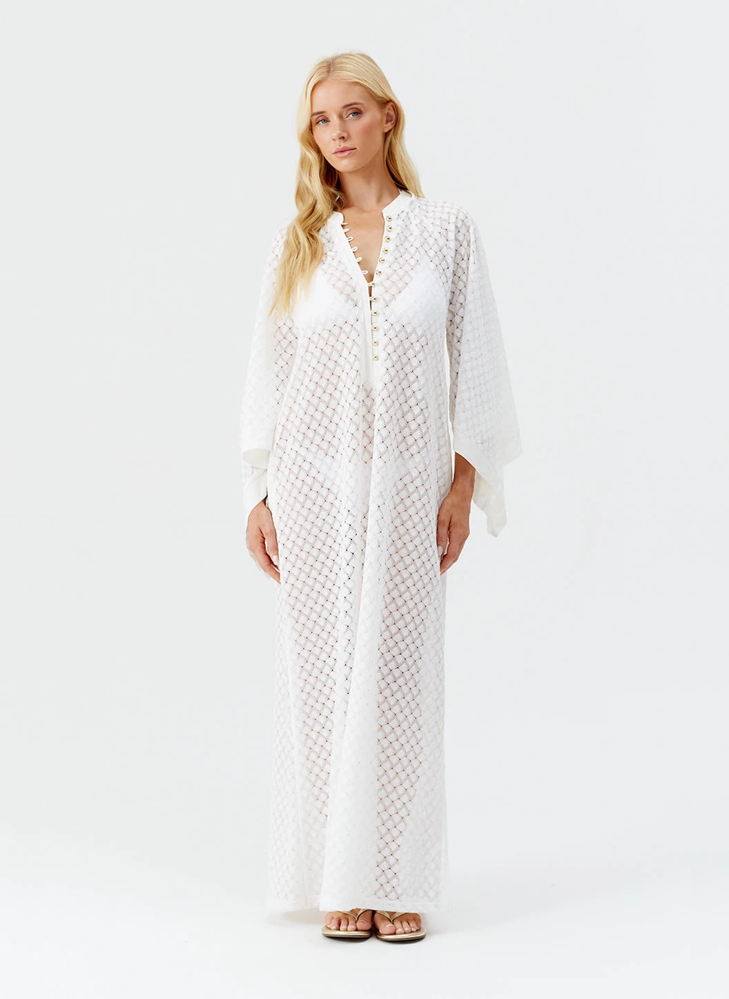 For effortless glamour on your next getaway, be sure to pack the Edie Kaftan. Timeless and fresh in White, this lightweight style is crafted from a diamond knitted fabric and is semi-sheer. Falling to a maxi length, it features luxe gold branded summarys and a thin belt with tassel detailing to define your waist. Sleeves fall to a dramatic point and enhance this flattering silhouette.