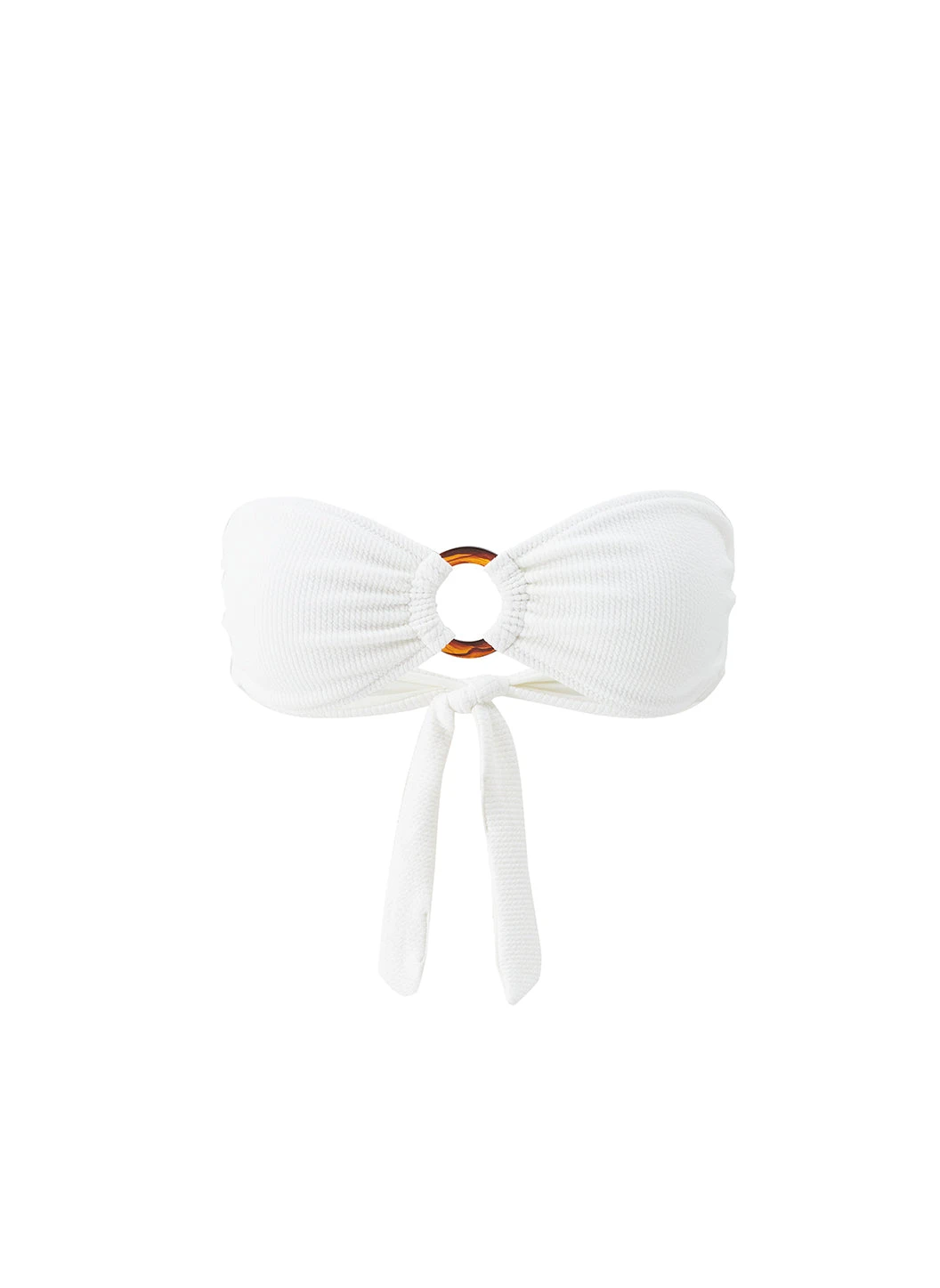 The essence of understated elegance, the exclusive Belgium Bikini Top in Ivory Ridges. Part of 2025’s exclusive offering, the Belgium is a tie-back, bandeau silhouette with large tortoiseshell accessory at the centre of the cups. Complete the look with matching bikini bottoms.