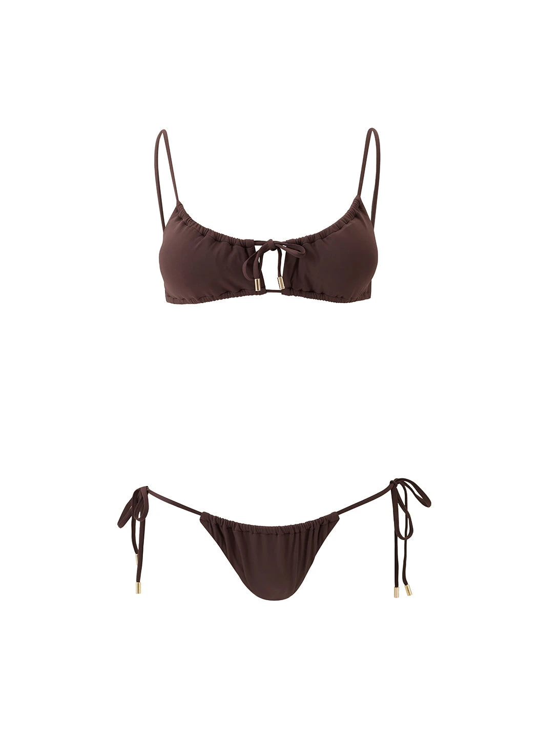 Standout from the crowd on your next getaway in the exclusive chocolate brown Egypt Bikini. On-trend, this sleek style has been crafted from premium swim fabric with SPF 50+ protection. Comprising a bralette top, it has over-the-shoulder straps with ruched cups and a keyhole cut out at the centre of the bust gives this design a sultry appeal. Matching skimpy bottoms tie at the sides and are finished with golden branded cord-ends.