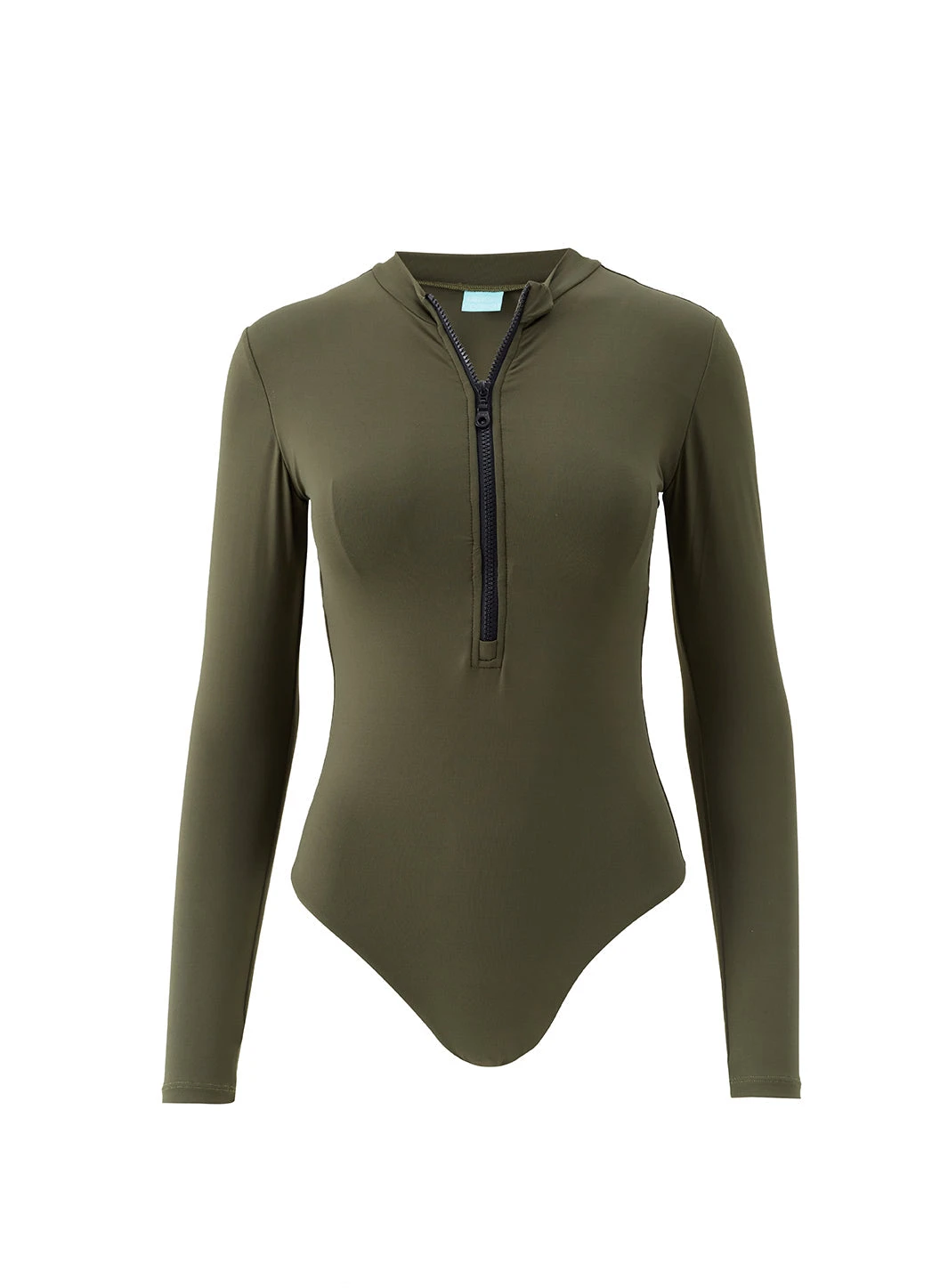 Blending style with function, invest in the Exclusive Monte Carlo Swimsuit. In a deep shade of ‘Olive’. Based on rash vest designs, this sleek long sleeve option protects from the sun’s harsh rays, featuring a contrasting zip, it offers an on-trend take on sporty swimwear.