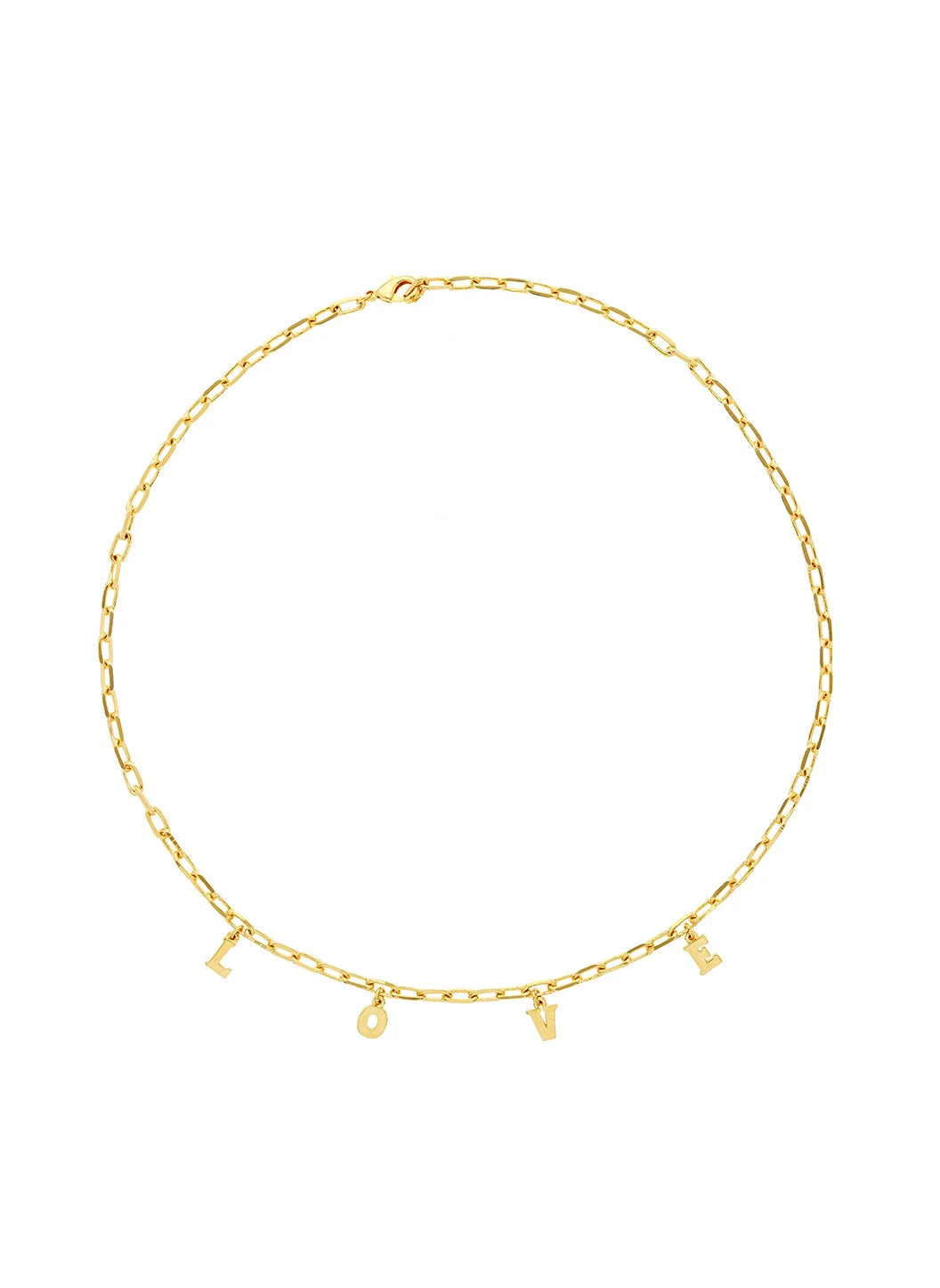 The Gold Chain LOVE necklace from Melissa Odabash’s new collection is designed with a simple chain and adorned with draping letters, a unique symbol of love. Suitable for stacking with your other necklaces or worn as a statement piece. Create a contemporary finish to your look with this on-trend style, match effortlessly with the new Gold Chunky Huggies.