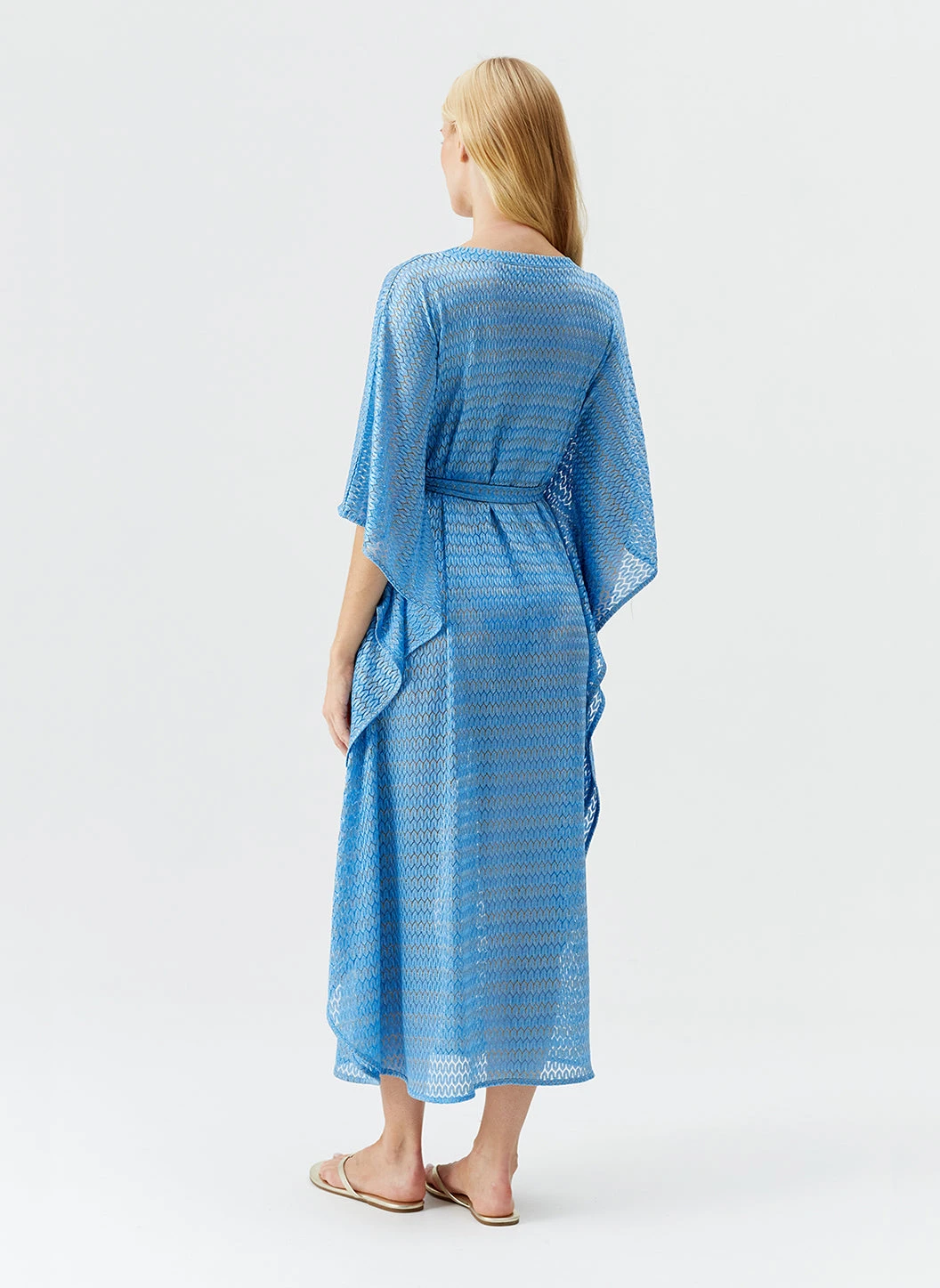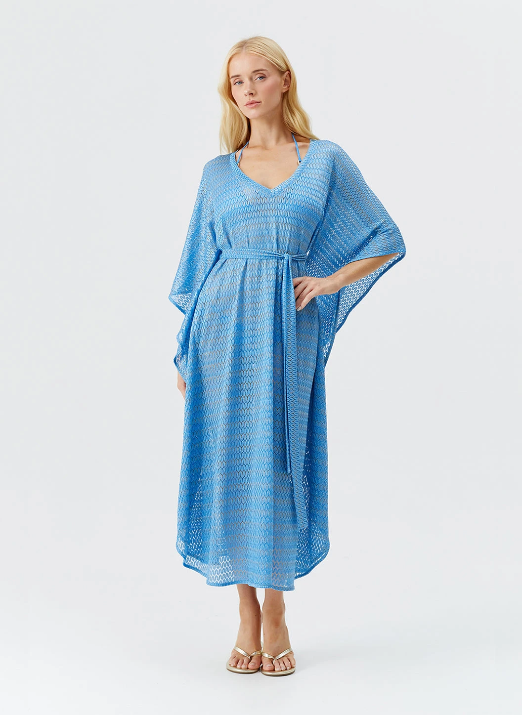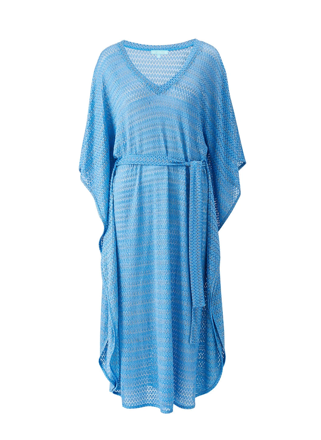 Vibrant and relaxed, add to your beach cover-up collection with the June Kaftan. Crafted from a luxe, fine patterned knit fabric with shimmering metallic details, this style is available in bright Ocean blue for Spring/Summer 2025. Falling to a dramatic maxi length, it features batwing sleeves, a deep ‘V’ neck and is finished with a fabric belt to cinch and define your waist.