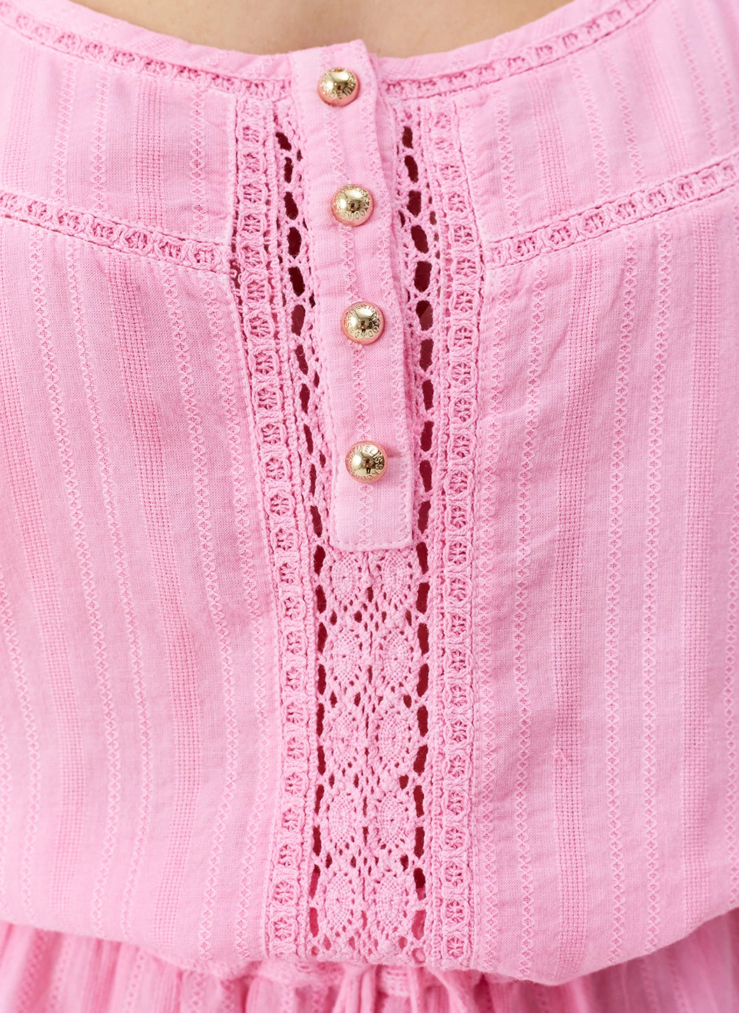 A style we return to time and again, be sure to pack the Kelly Dress for your next beach getaway. Falling to a short, mid-thigh length, this pretty Pink style has been crafted from pure, premium cotton. Cut for a loose fit, this relaxed style features slim straps and delicate crochet detailing throughout. Luxe gold summarys elevate the design, while a drawstring waist with signature branded cord-ends provides added comfort.