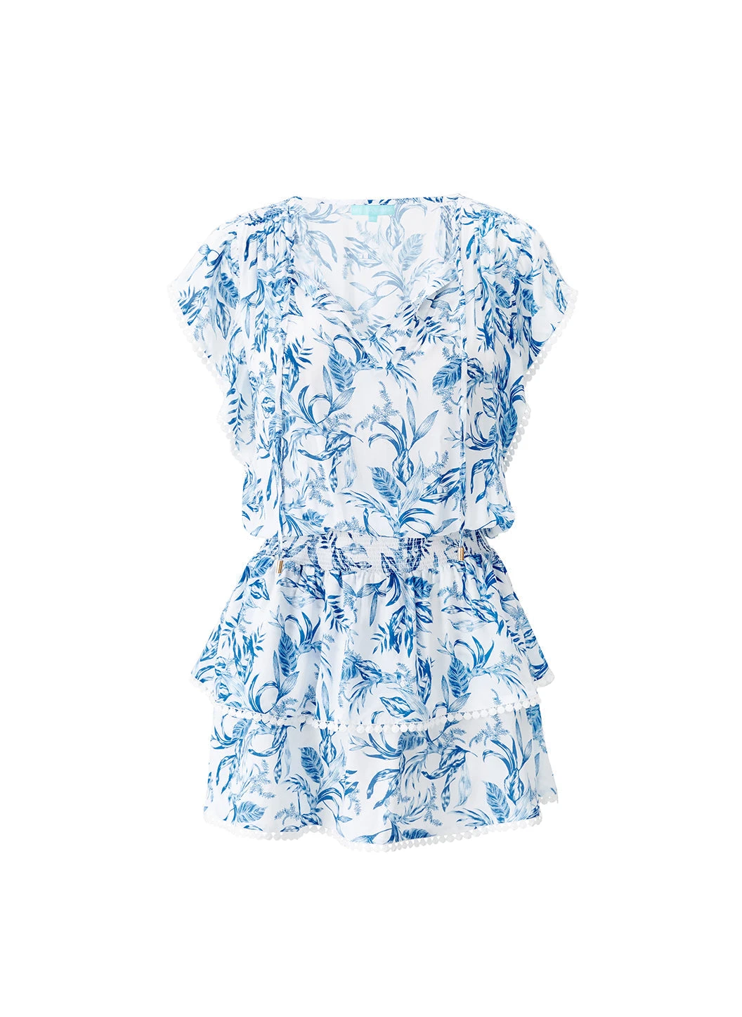 An iconic Odabash design, the Keri Dress has become a classic for a reason. Imbued with a relaxed, bohemian charm, this style is emblazoned in our botanical Blue Leaf motif for Cruise 2025. Cut for a loose fit, it falls to a mid-thigh length with a playful tiered skirt and delicate crochet trims. It features capped sleeves and a comfortable shirred waist, with ‘V’ neck and a tie detail allowing you to swap to a keyhole neckline.