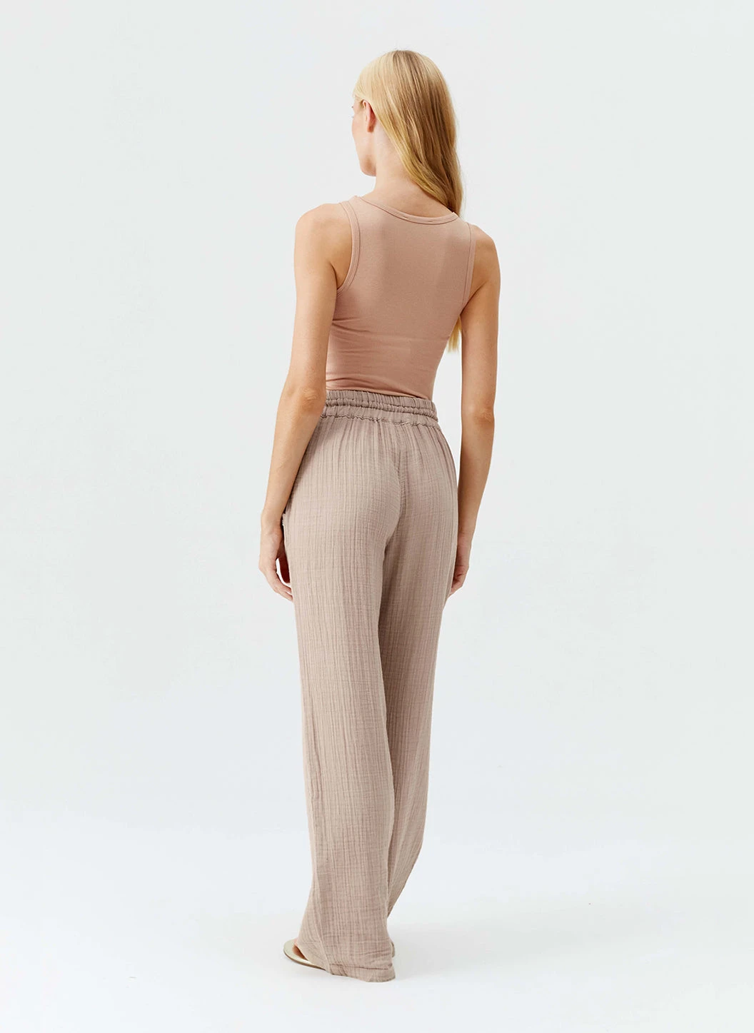 A staple style we return to each season, add to your destination wardrobe with the Krissy Trousers. Ideal for slipping over your favourite Odabash swimwear or on days away from the beach, this pair is crafted from premium cotton. Elegant and chic in Beige, they’re cut for a relaxed, straight-leg fit, with two slip pockets at the hips and an elasticated waistband, finished with signature gold branded cord-ends.