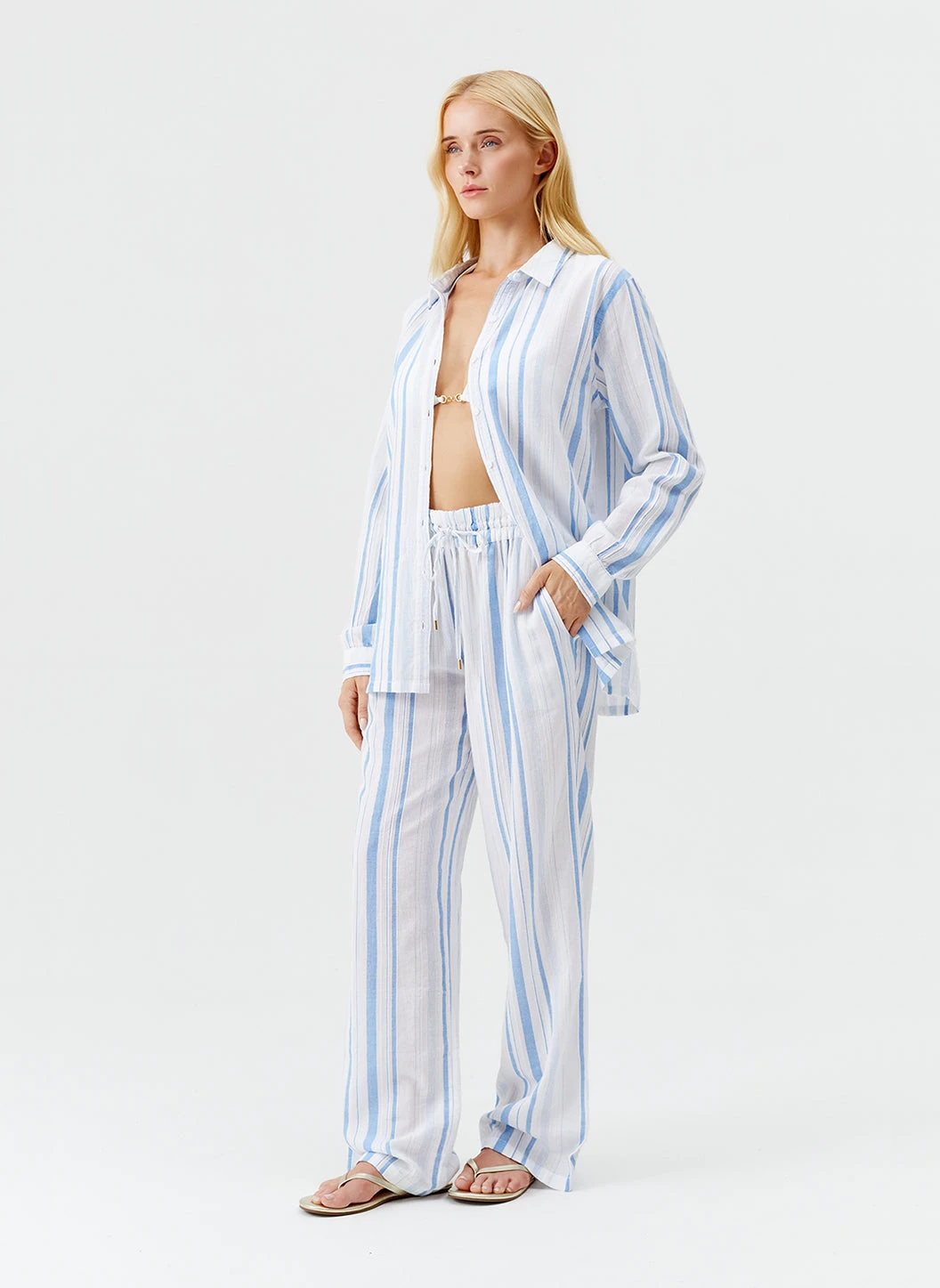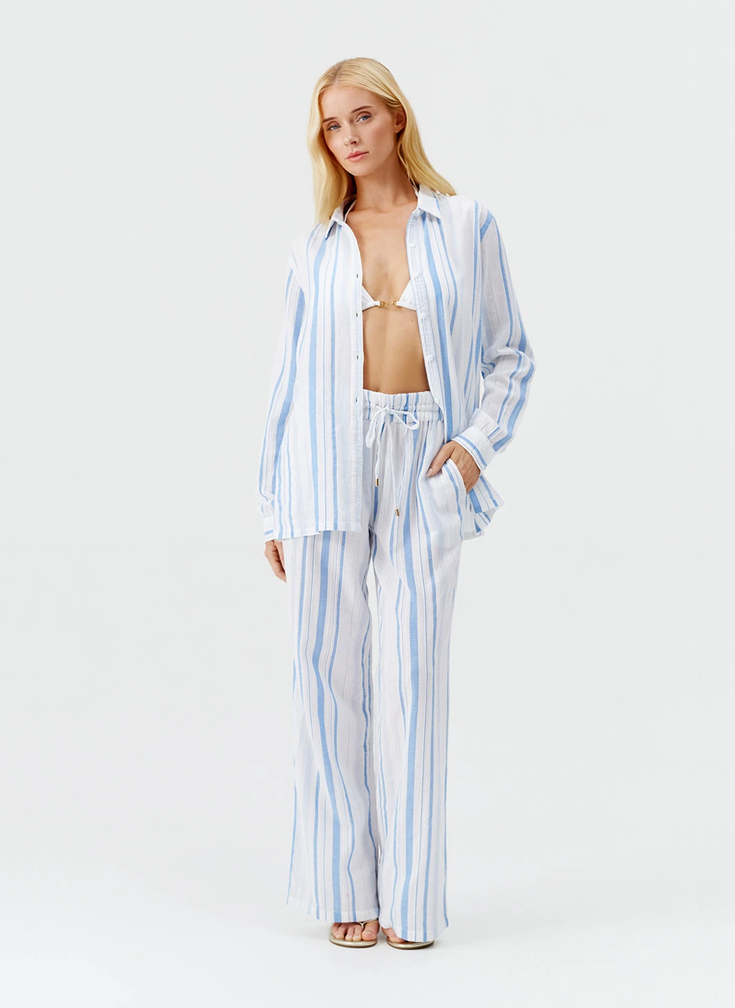 Take a relaxed approach to holiday dressing with the Krissy Trousers. An Odabash staple, this popular style has been updated for High Summer in white and blue Oasis Stripe. Crafted from pure cotton, this pair is cut for straight-leg fit with wide hems and two slip pockets at the hips. An elasticated waistband adds to their laid-back appeal, finished with signature gold branded cord-ends. Pair with the Tina Shirt to create a chic summer co-ord.
