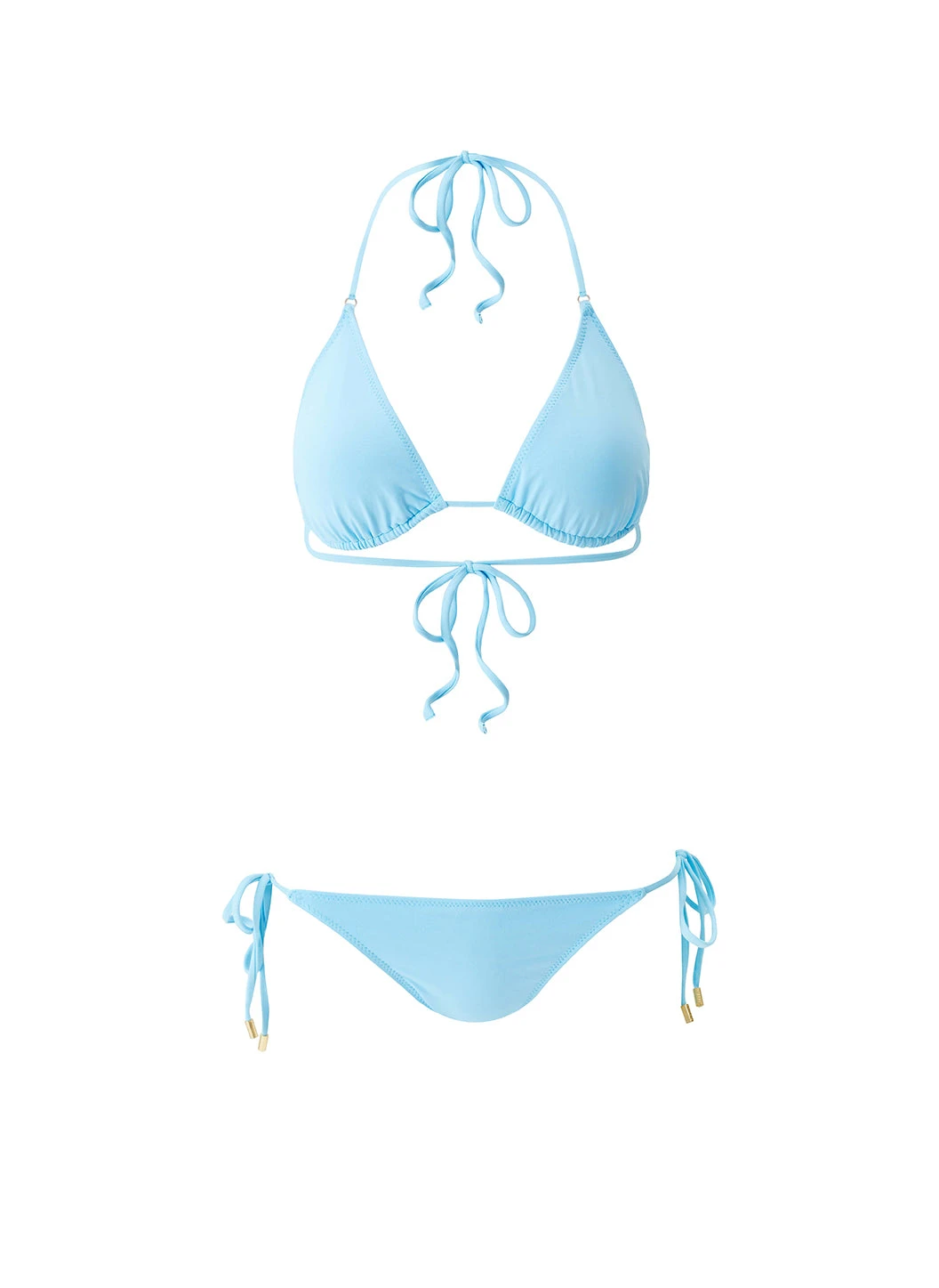 Add to your swimwear collection with timeless pieces like the Malibu Bikini. Fresh and vibrant in this season’s Celeste blue with SPF 50+ protection, this style elevates the classic triangle bikini. The top is unpadded with thin tie straps that allow you to create the perfect fit, and the small gold ring trims connect the cups and straps. Matching bottoms are adorned with signature gold branded cord ends, tying at the side, giving medium coverage.