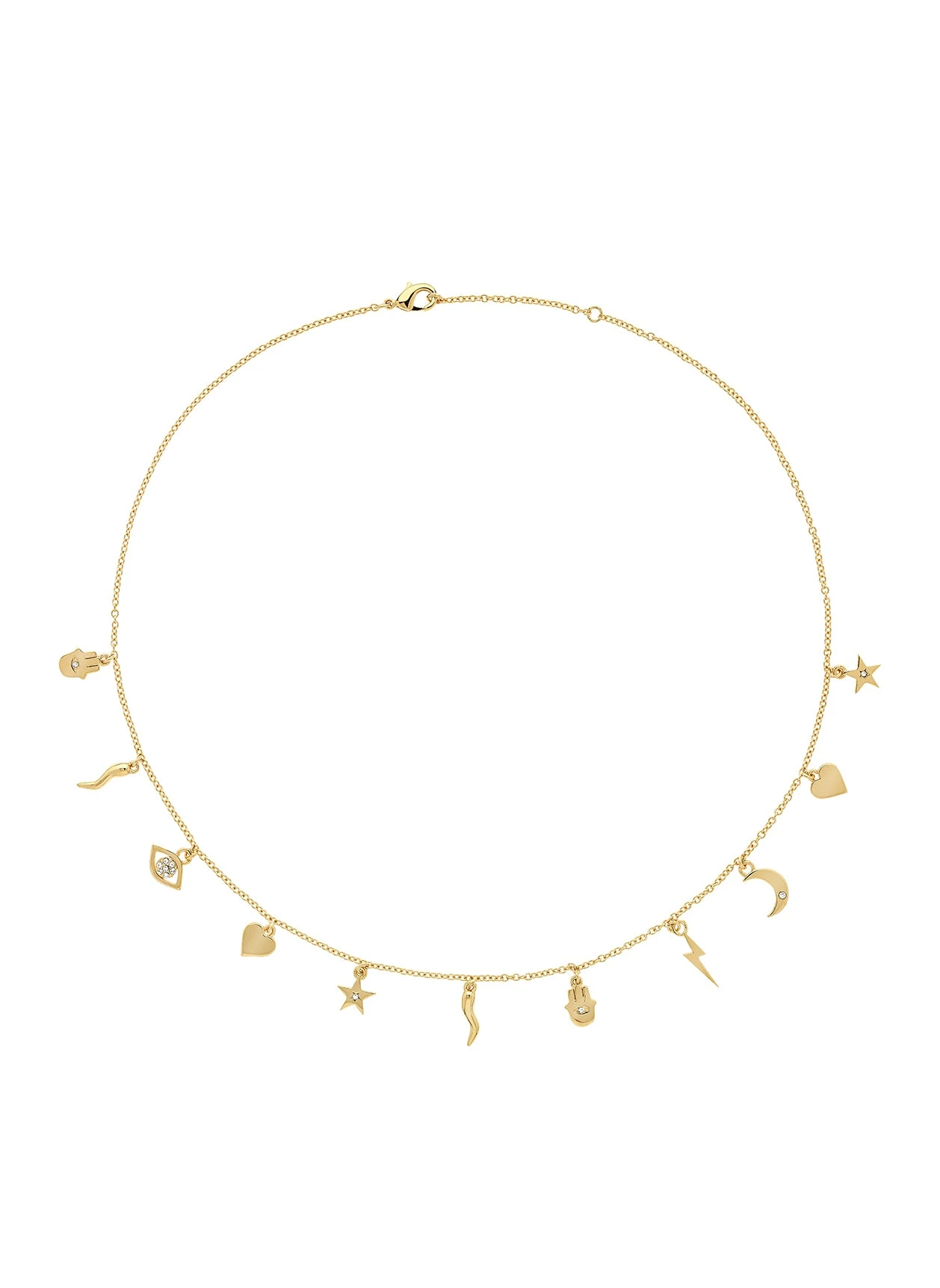 Dainty charms inspired by classic celestial elements and decorated with sparkling crystals hang beautifully from this delicate gold long chain. This Gold Crystal Charm Necklace is the perfect new statement piece to add to your jewellery collection. Wear this piece over a high-neck top to add a layer of luxury to your look. Also available in a similar style charm bracelet. Â