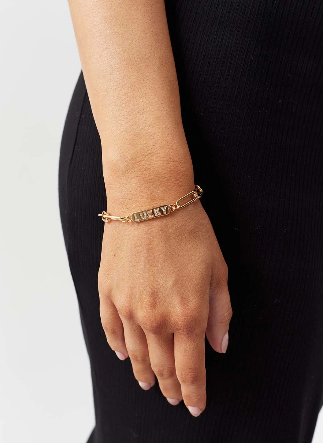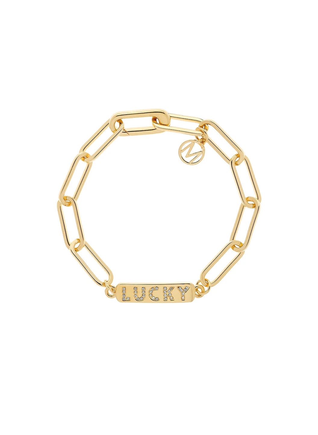 Discover the new Gold Lucky Crystal Bracelet from Melissa Odabash, the symbolic piece will add an element of sparkle to your jewellery collection. Designed with a sleek paperclip chain and a striking tab emblazoned with crystals on the ‘Lucky’ centre. Team with the matching Gold Paperclip Necklace to create the ultimate Odabash pairing and complete your beachwear look with a fedora and sandals.