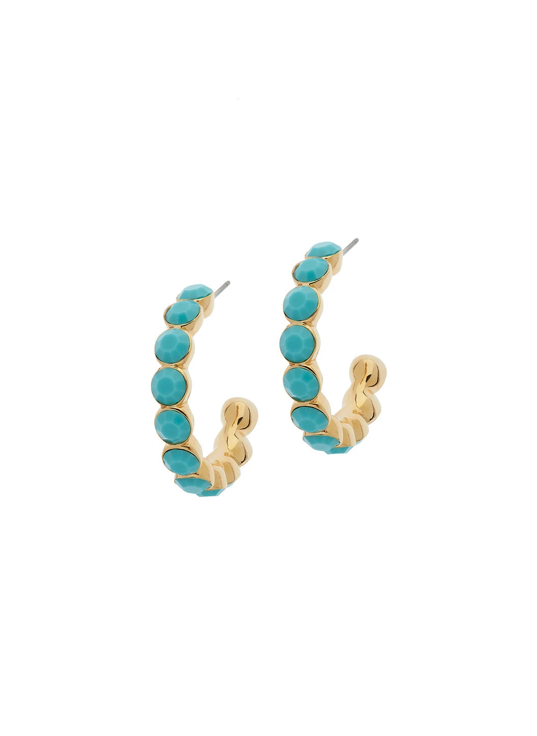 Upgrade your jewellery collection with the Gold Turquoise Hoop Earrings, new to Odabash for 2025. In a medium size, this pair are embellished with stone crystals in a striking turquoise tone which is synonymous with the Odabash brand, this elegant style offers an opulent finish to any look. Complete your look by pairing with the Gold Turquoise Enamel Stone Necklace for standout style.Â