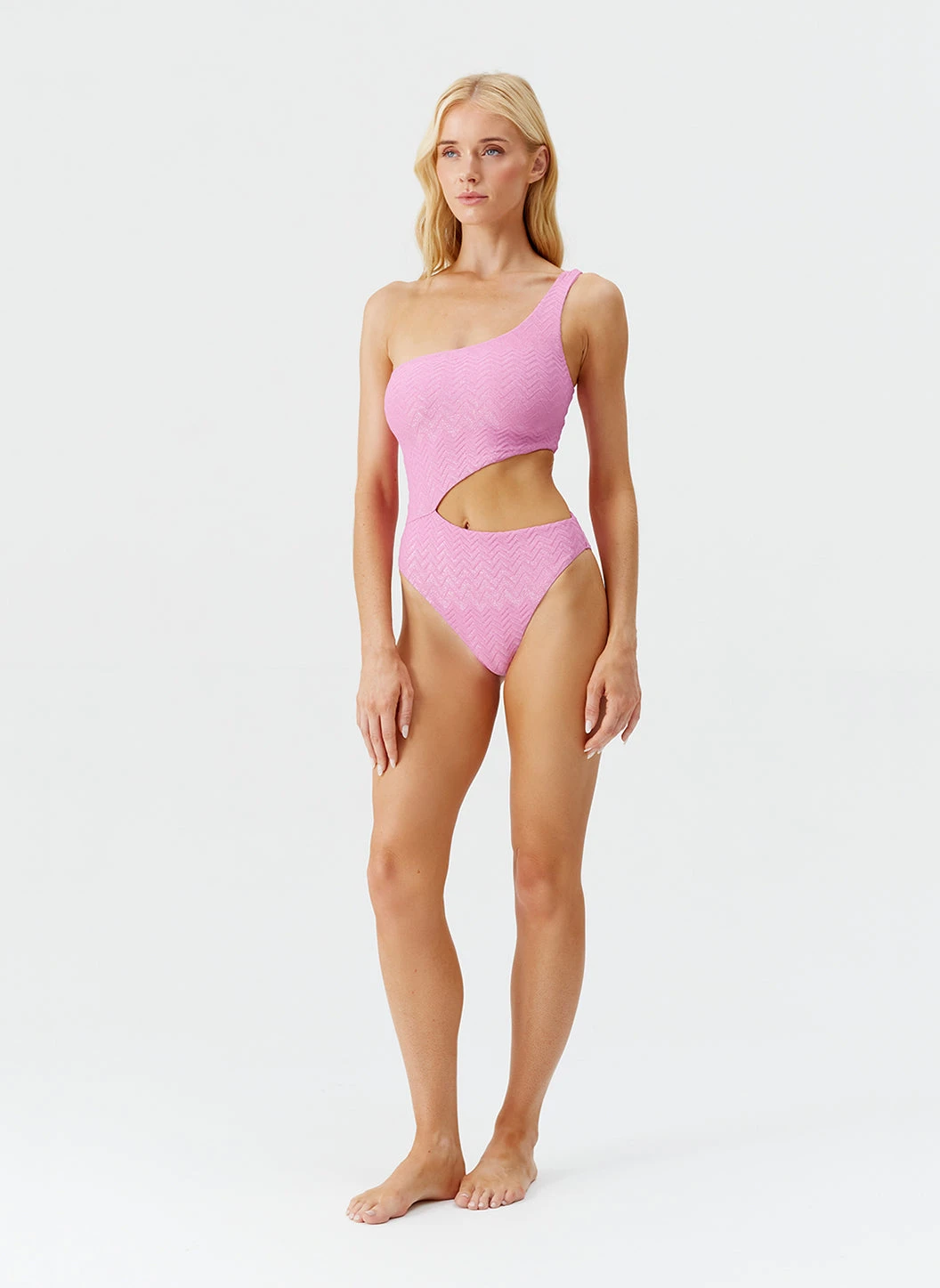 Fun and flirty, give your swimwear collection a dramatic update with the Nassau Swimsuit. Available in our feminine Pink Zigzag for Spring/Summer 2025, this piece is crafted from a luxe, textured fabric with a raised zig-zag motif. Asymmetrical in design, this one-shoulder swimsuit features an over-the-shoulder strap with a daring, large cut out at the side. Wear with the Sebena Kaftan for a coordinated look as you make your way down to the beach.