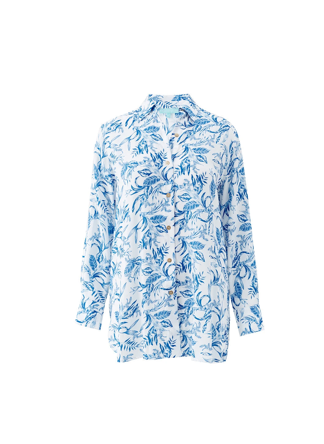 Add to your destination wardrobe with versatile pieces that give you multiple ways to wear like the Paige Shirt. Emblazoned in our hero Blue Leaf print of the Cruise 2025 collection, this style falls to mid-thigh. Cut for a loose fit, this piece boasts full length sleeves, a traditional shirt collar and summary fastenings. Slip over your favourite Odabash swimwear or pair with Olivia trousers in the matching print for an effortless look for a day exploring the local town.