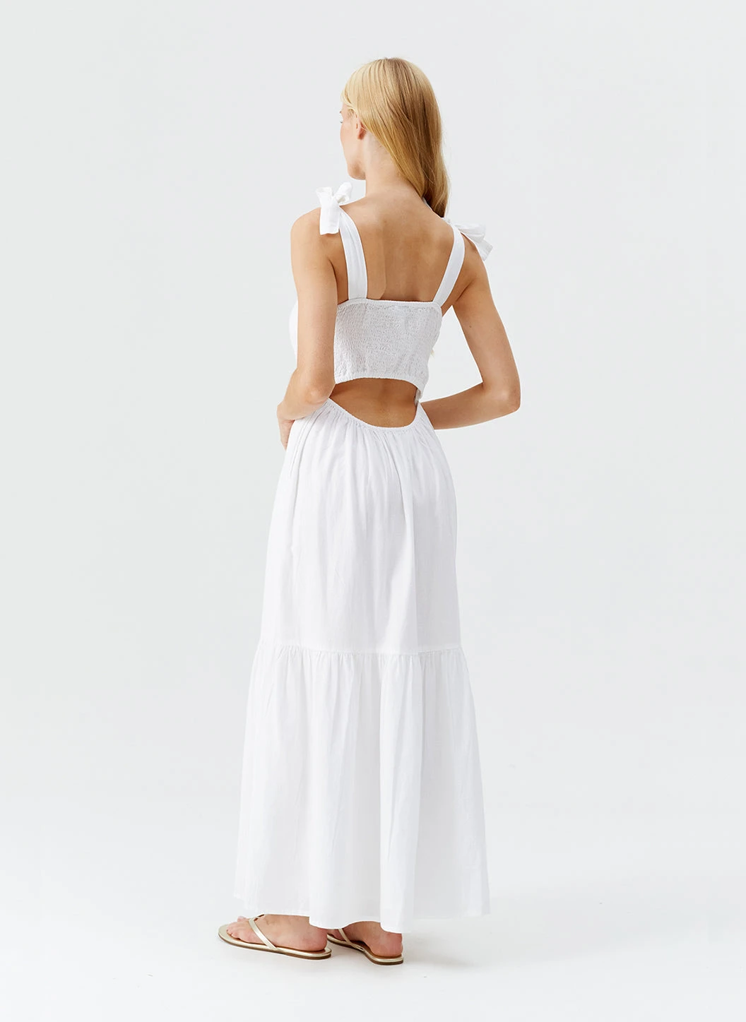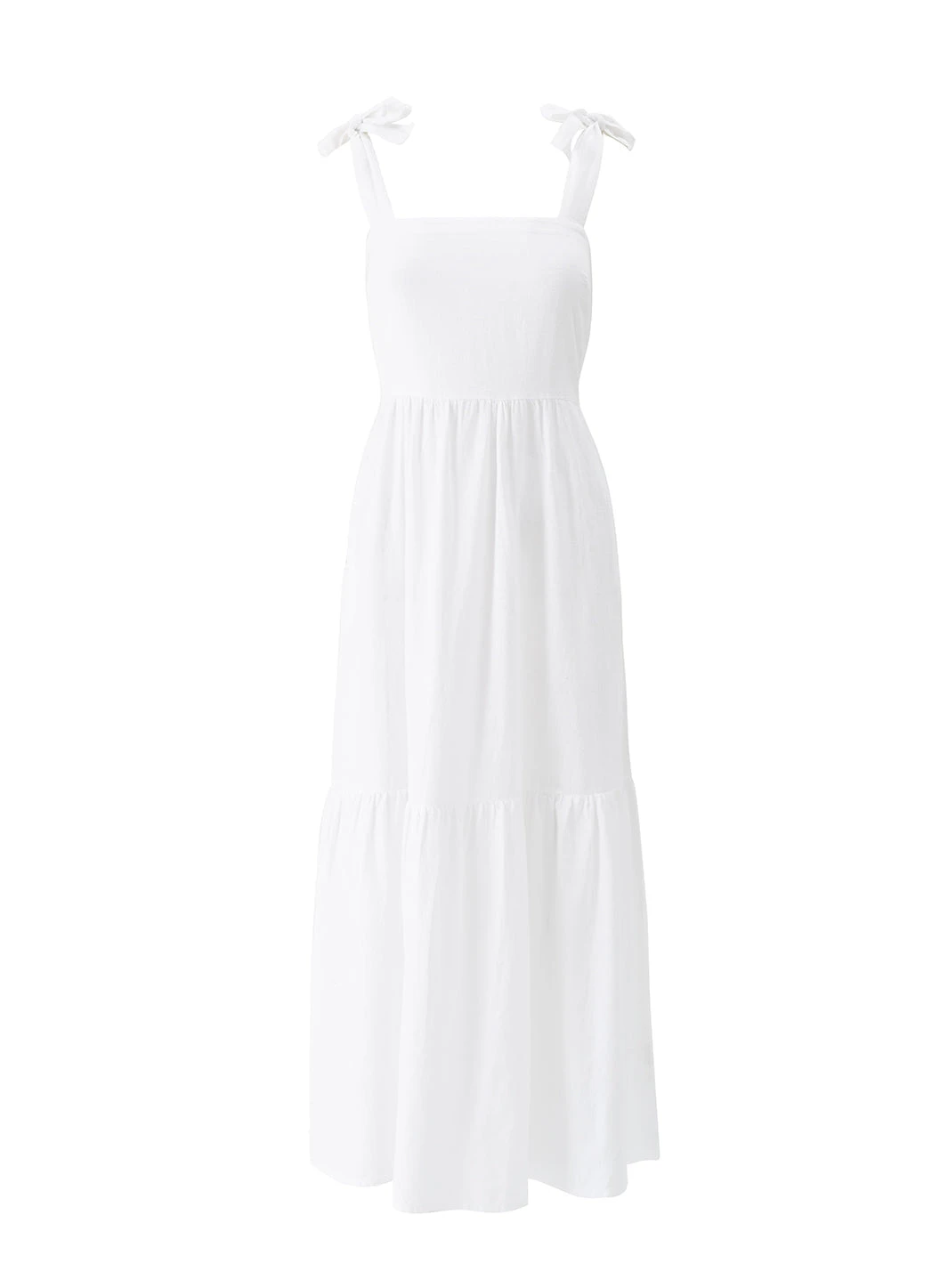 Build your warm-weather wardrobe around classic pieces you’ll return to again and again like the Posie Dress. Crafted from a luxe cotton, linen blend, this timeless White style falls to a sweeping maxi length. A tiered skirt gives it a bohemian charm, while the straight neckline and bow detail straps lend it a romantic appeal. Style with simple leather sandals and our classic fedora for effortless holiday dressing.