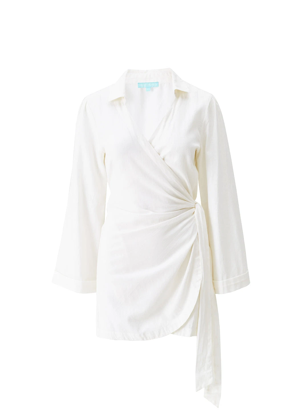 For polished, relaxed holiday dressing, look no further than the Ruby Dress. Crafted from a luxe cotton, linen blend, this chic Ivory piece boasts a flattering wrap silhouette. Falling to a short, mid-thigh length, it features long sleeves and a ‘V’ neckline with a collar. Gathered detailing flatters and cinches the waist making this style ideal for wearing as you enjoy a leisurely lunch at your favourite spot.